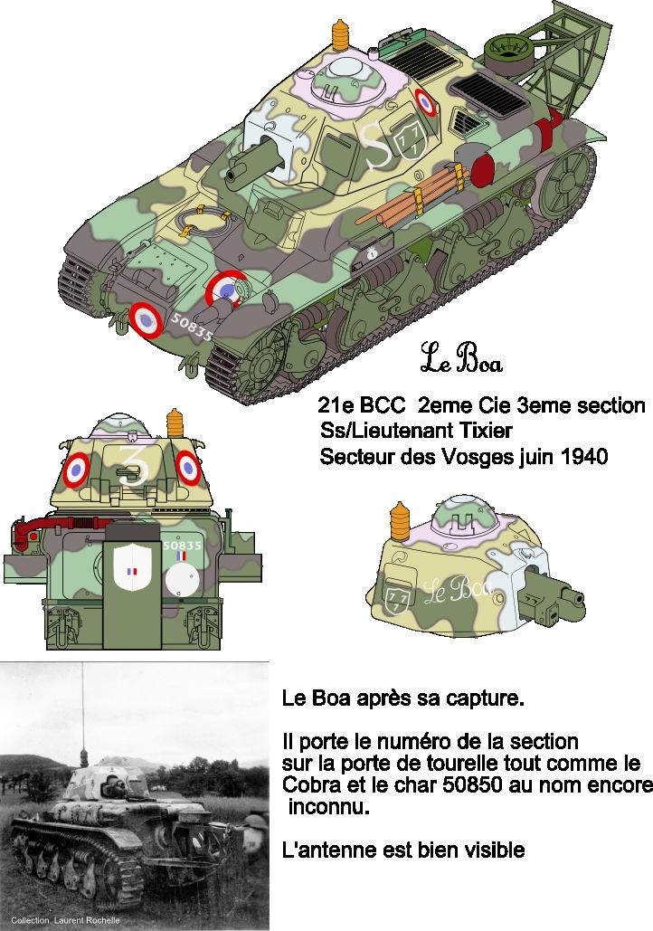 3ème section: Le Boa, équipé d'une antenne TSF porte sur la queue passe tranchée une marque blanche de circulation nocturne en forme d'écu. Mais ici, seul le tricolore y est apposé. Ni immatriculation, ni signe tactique n’y figurent. Le cercle blanc sur la porte du moteur est de taille inférieure à la normale, et disposé moins décalé sur la droite que sur les autres chars de la compagnie.
