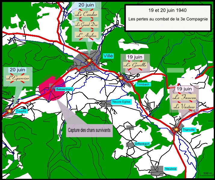 Le lendemain 19 juin, c’est à Thanvillé que débute l’action où la Compagnie, en fait la 1ère Section, doit essayer de bloquer l’avance ennemie soutenue par une compagnie du 226e Régiment d’Infanterie. L’infanterie allemande met en œuvre des canons antichars qui endommagent le Faucon du Lieutenant Desjonquières et mettent hors de combat le Vautour dont le chef de char, le caporal Lejeune est tué. Le repli sur Villé, inévitable est effectué en bon ordre. Le Lieutenant Desjonquières doit faire réparer son Faucon et occupera en attendant, l’Epervier.