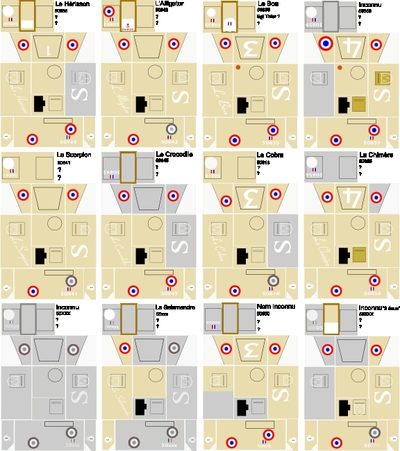 4ème section: Le 50859 LE DRAGON semble être le char du chef de section (antenne), et a probablement tardivement reçu des épiscopes à la place des diascopes, ce qui expliquerait les différences de camouflage constatées. Il n'est pas possible de savoir pour l'instant s'il portait une queue passe tranchée ou non. Cela serait très vraisemblable car à la 2ème Compagnie, les 3 autres chefs de sections supposés l'ont.
