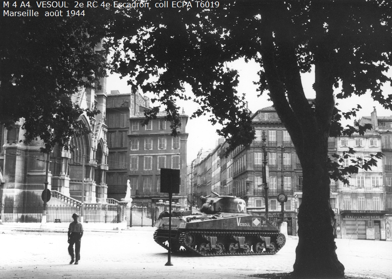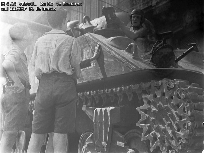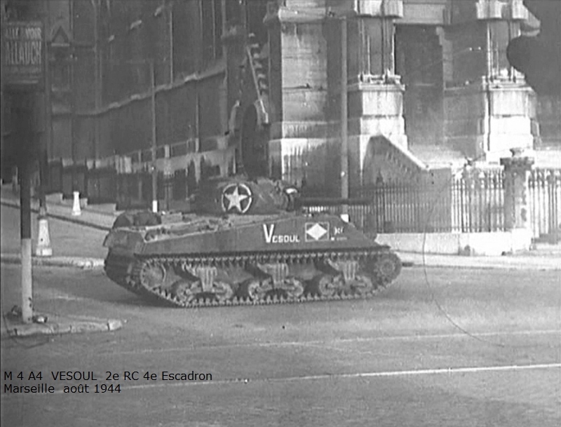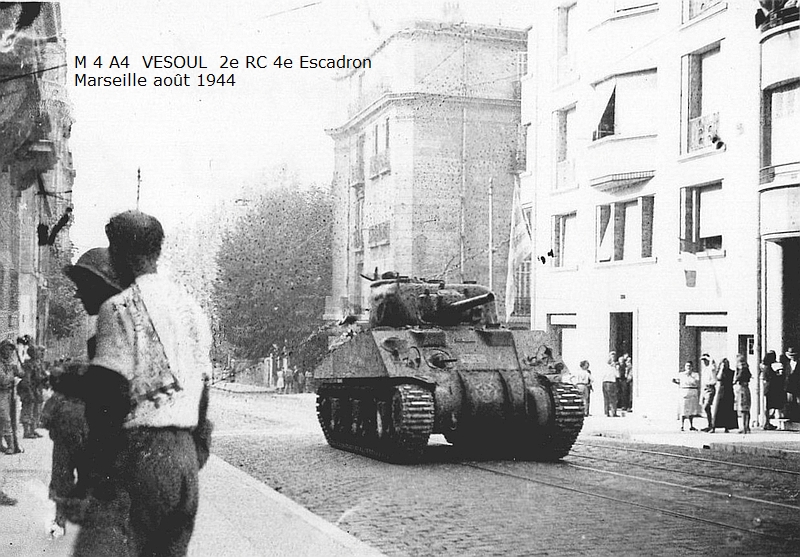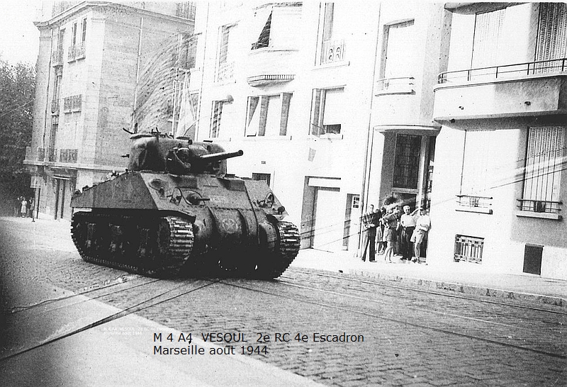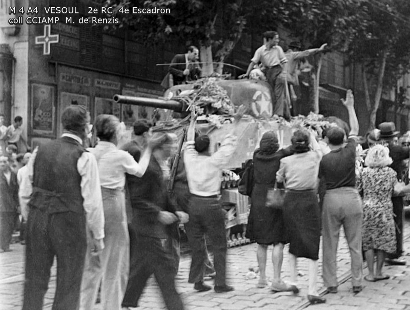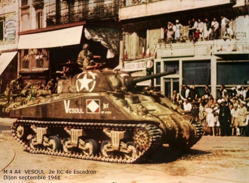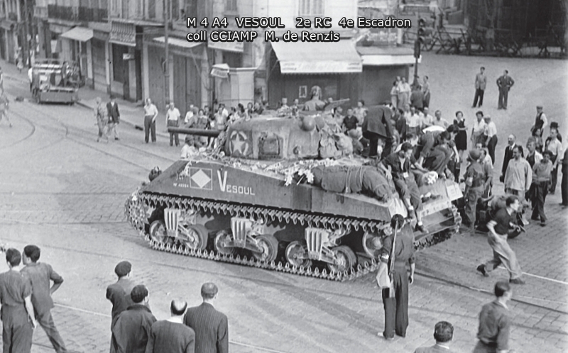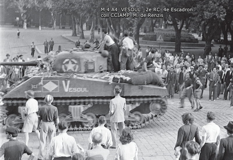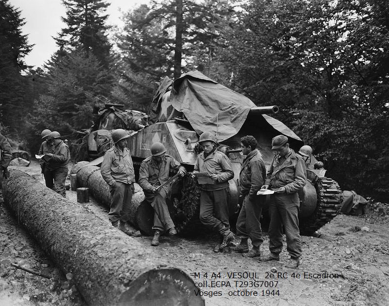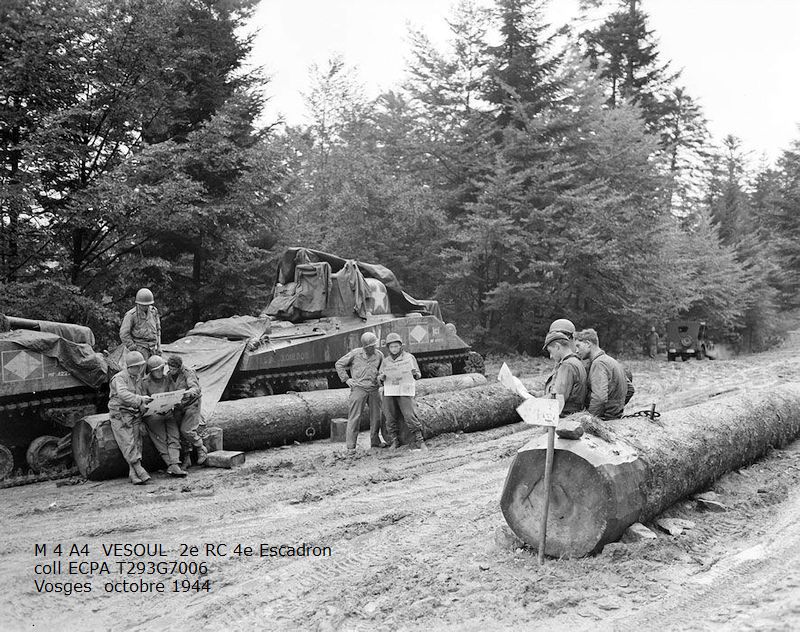 Combats des Vosges Tête de la Chappechatte octobre 1944 Le 16 octobre 1944, avant le lever du jour, les chars et T.D. descendent le sentier escarpé de la Tête de la Chappechatte vers Travexin (Vosges) occupé la veille. En dernière position, le VESOUL se retrouve immobilisé. Presque déchenillé, il bloque la piste détrempée et déjà obstruée par un éboulement qui s'est produit après le passage des autres chars. Dès le lever du jour l'artillerie ennemie réagit violemment. Disposant d'excellentes vues sur toute la vallée, elle bombarde Travexin et ses abords. Immobilisé en terrain découvert, le VESOUL est pris à partie. L'équipage est surpris par le tir ennemi au cours de ses vains efforts de dépannage. L'adjudant Chardac, chef de char, et les cuirassiers Quinsac, Bernard et Berto sont blessés, seul le cuirassier Ferrand est indemne. Le 19 octobre, au cours de la nuit, le peloton d'échelon du 4e escadron tente à nouveau de dépanner le VESOUL sous les obus. Les moyens de levage sont insuffisants, les dépanneurs doivent renoncer... Le 20 octobre, à la tombée de la nuit, le peloton d'échelon du Corps prend à son compte le VESOUL. Un engin de dépannage a été poussé sur la Tête de la Chappechatte par le chemin refait par le génie. Tout est en place, quand le câble casse... c'est de nouveau l'échec... Le lendemain, le VESOUL est à nouveau bombardé et mis en flammes par l'artillerie allemande.