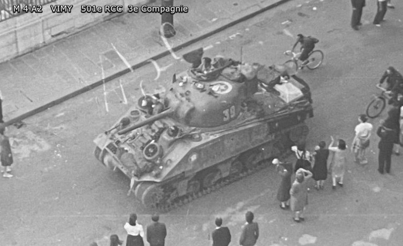 Equipage : Chef de char : Adjudant Huot Tireur : Thiolat Radio-chargeur : Mifsud Pilote : Jolivet Aide-pilote :Forest Char en panne le 20 août 1944, tout l'équipage passe sur le FRANCHEVILLE. |