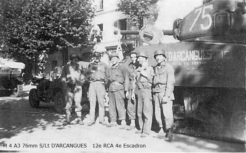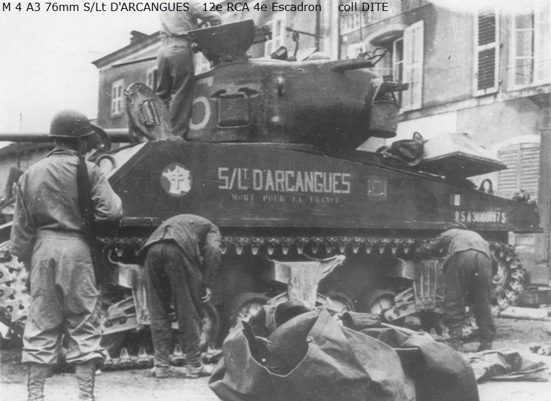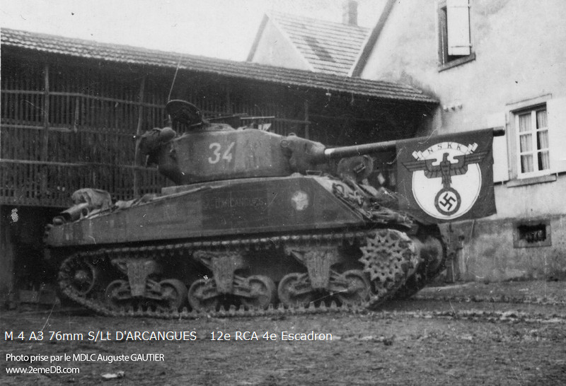 | Perçu le 15 août 1944. Une photo prise en avril 1945 montre un char baptisé S/Lt D'ARCANGUES mais portant le n°34. Par ailleurs le lettrage du nom est totalement différent. |