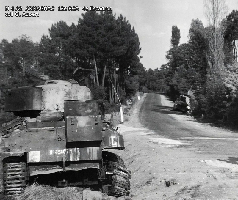 Chef de char : Maréchal des logis Comballe Tôt ce matin du 10 août 1944, une colonne blindée du 12e RCA progresse sur la D20 au nord du Mans. Le 1er peloton atteint Courceboeufs puis rejoint la D6 qui relie Ballon à Bonnétable, au sud de Mézières-sous-Ballon. Le BORDELAIS et l'ARMAGNAC s'engagent vers l'est, et tombent dans une embuscade, les deux Sherman sont incendiés. |