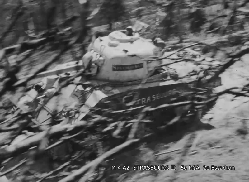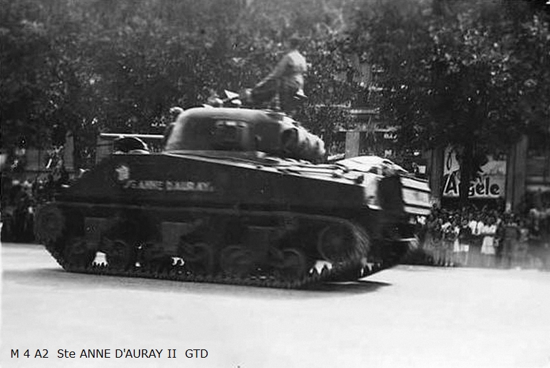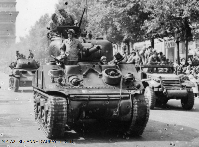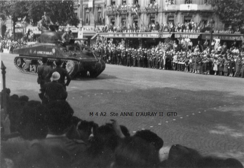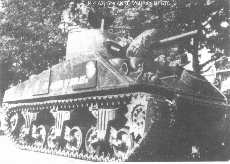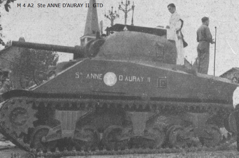| Détruit à Carrouges le 13 août 1944. Un soldat allemand s'échappe d'une colonne de prisonniers et réussit à poser une mine magnétique sur le char avant de s'enfuir. Selon un autre témoignage, l'allemand serait sorti d'une haie. Le STE ANNE D'AURAY était le char de commandement du Colonel Dio. Le Capitaine Deveaux, chef du 3e Bureau, le Lieutenant-Colonel Vézinet, chef d'état-major et le Capitaine d'Allonnes sont blessés. Pilote : André Darrigrand |