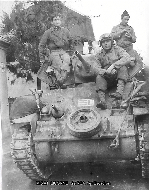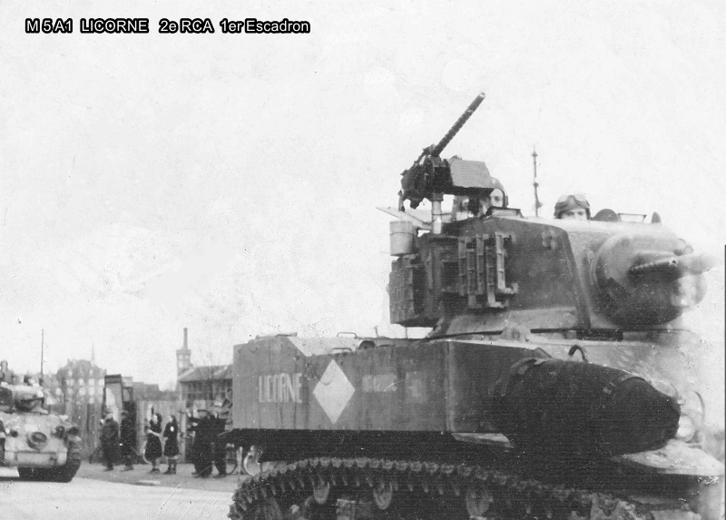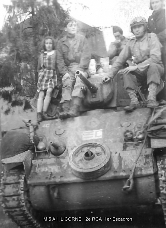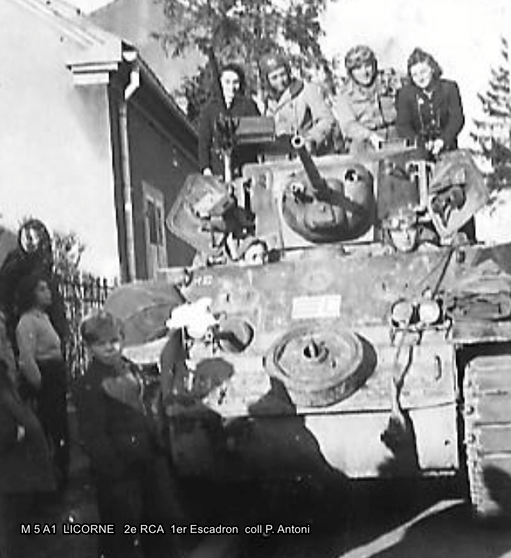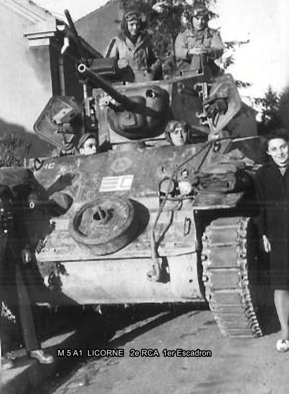 19 novembre 1944. Le char LICORNE entre à Mulhouse en tête du 1er escadron. Février - avril 1945. Bade-Wurtemberg (Allemagne) Le 1er escadron et le char LICORNE se distinguent dans les durs combats lors de la prise de KURZEL, KIPPENHEIM, RUST et MITTERSHEIM. (7 février - 15 au 19 avril 1945).